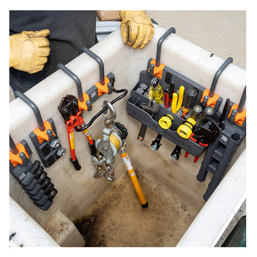 The Bucket Work Center is an ecosystem that will revamp the way a Lineman works. It allows Lineman to customize their workspace, just like other professionals customize their office space. Klein Tools' Socket Storage Module has six slots that fit commonly used impact socket sizes used in utility work. This will be the Lineman's office. The S-Hook System easily attaches to aerial buckets with a standard 2-inch or 3-inch (5.1 or 7.6 cm) bucket lip. An assortment of modules are available to customize each workstation to fit the tools needed for the job.