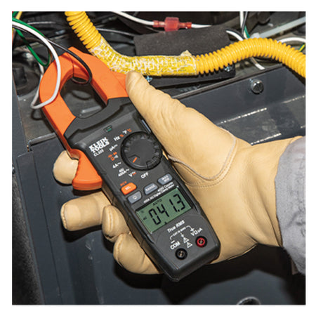 Klein Tools CL320 Clamp Meter is an automatically ranging true root mean square (TRMS) digital clamp meter that measures AC current and NCVT via the clamp, AC/DC voltage, DC microamps, resistance, continuity, frequency, capacitance, and tests diodes via test-leads, and temperature via a thermocouple probe. Features include Auto Range to improve efficiency and speed when making measurements; Diode Test to troubleshoot malfunctioning diodes; Max/Min to understand the variability from average of an electrical property being measured, and DC Microamps measurements when working with flame sensors.