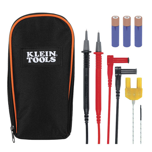 - Rated IP40 for ingress protection, withstands drops from 6.6 feet (2 m), and includes right-angle input test leads, thermocouple, storage pouch, instruction manual, and 3 x AAA batteries