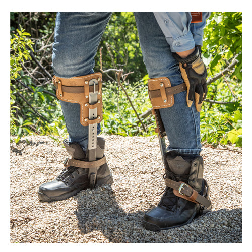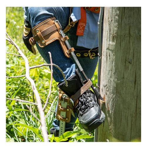 Klein's Tree Climber set includes the pads, straps, leg irons, stirrups and 2-3/4-Inch gaffs. The secure sleeve and leg iron connections are adjustable in 1/4-Inch (0.6 cm) increments. Contoured leg irons help position gaffs securely and comfortably. The replaceable gaffs firmly attach to the leg iron with a center pin and two TORX® screws. High-grade leather climber pads are cushioned for maximum comfort. Klein Tools has been providing occupational protective equipment to linemen since the first telegraph poles were strung. Klein components should not be interchanged with components made from other manufacturers because Klein cannot guarantee that those components are properly designed or are free of defects in materials or workmanship.