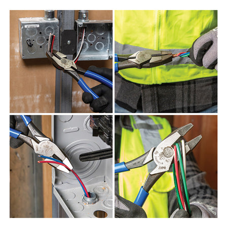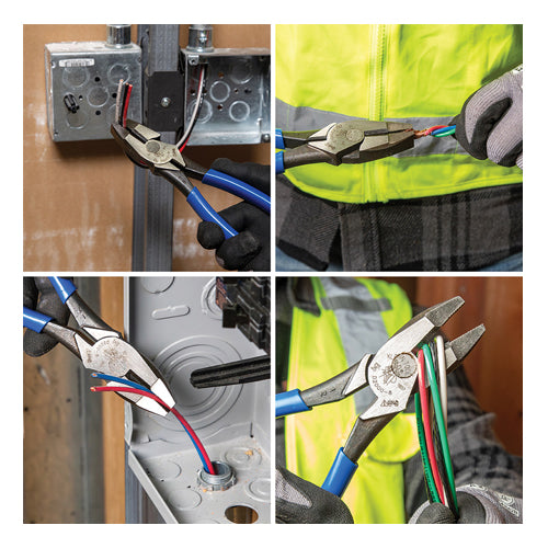 These lineman's pliers are made of custom, US-made tool steel and feature combination polished and black-oxide finish plus plastic-dipped handles for comfort and ease of identification. 2000 series knives cut ACSR, screws, nails and most hardened wire. The high-leverage design provides 46-Percent more cutting and gripping power than other plier designs. Cutting knives are induction hardened for long life. The hot-riveted joint ensures smooth action and no handle wobble. Streamlined design with sure-gripping, cross-hatched knurled jaws. Unique handle tempering helps absorb the ''snap'' when cutting wire. The head is precision-hardened for on-the-job toughness.