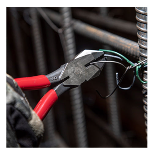 These Ironworker's Pliers cut and twist rebar tie wire. They feature aggressive teeth for a strong grip when twisting and pulling. The spring-loaded design enables self-opening. Exclusive handle tempering absorbs the snap when cutting wire. Hook-bend in the handle provides added grip and leverage.