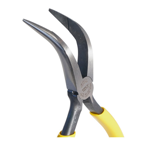 Klein Tools Curved Long-Nose Pliers feature a 70-Degree bent nose for greater versatility. The curved handles provide greater control for work in confined spaces. Knurled jaws help wrap and loop wires. Made of forged steel for maximum durability.