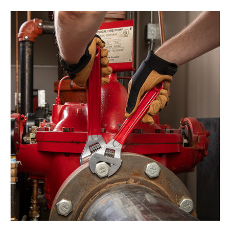 The Klein Tools adjustable wrench is designed with smaller size but the ability to handle heavy-duty jobs. This wrench is manufactured from heat-treated alloy steel for strength and has a high polish chrome finish. It also features a lightweight 10-inch design with an extra-capacity jaw.