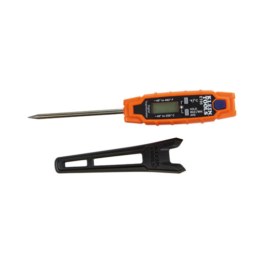Klein Tools ET05 is a digital thermometer that takes ambient and direct-contact readings in both Fahrenheit (°F) and Celsius (°C) scales. The rugged, portable design makes it the choice of HVAC field service teams. The protective sheath cleverly serves as a handle to extend reach.