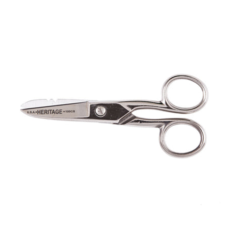 These Electrician Scissors are nickel plated with wire stripping notches for 19 and 23 gauge wire. Blades hardened to 58C Rockwell for extra cutting life with serrations for holding wire while it cuts. High-quality blades produce a sharp, clean, uniform cut.