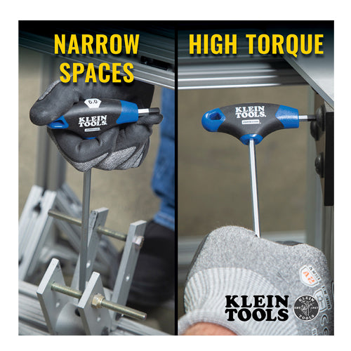 Klein Tools hex keys are the tools professionals cannot afford to be without. The Journeyman™ Hex T-Handle from Klein Tools delivers more torque to the fasteners than standard hex keys. Heat-treated and tempered for superior strength and durability. Klein hex-keys are designed for a precise fit in sockets, preventing slippage and stripping of the socket.