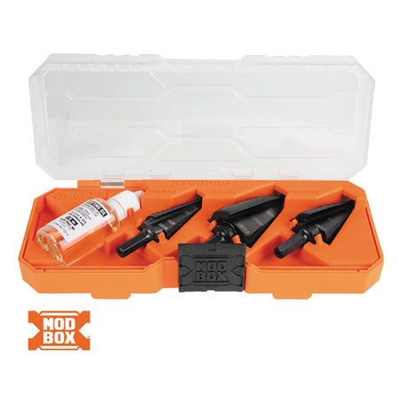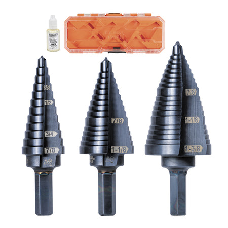 The Premium Electrician's 3/8-Inch Hex Step Bit Set contains 3 step bits sized 7/8-Inch, 1-1/8-Inch, and 1-3/8-Inch for creating hole cutouts in panels and j-boxes to accommodate most commonly used 1/2-Inch, 3/4-Inch, and 1-Inch conduit. Dual straight flutes help pull the step bit through the material for clean cuts. The aluminum titanium nitride coating is 10 times more durable than steamed black oxide for longer bit life. The durable 3/8-Inch hex shank provides a firm, positive grip. The compact, modular case comes with cutting oil and is designed to nest neatly within MODbox™ toolboxes and on the MODbox™ Case Adapter Side Rail Attachment.For use on steel (up to 16 gauge), wood, plastic, and aluminum.