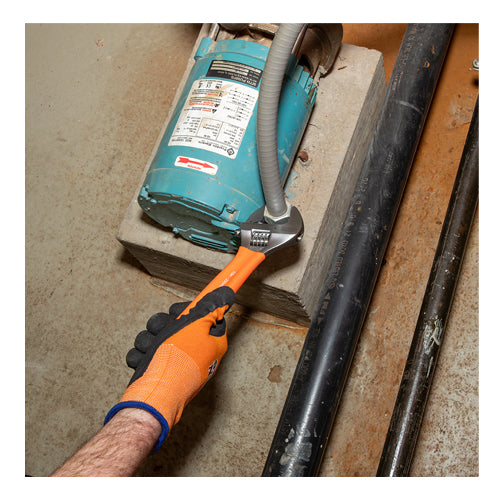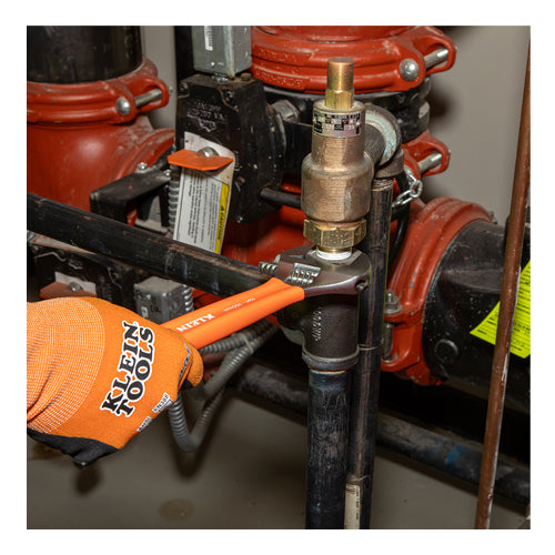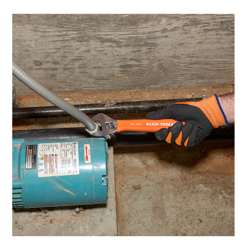 Klein Tools' 10-Inch (250 mm) Extra Capacity Adjustable Wrench is made of forged, heat-treated alloy steel for maximum strength and light weight. Jaws are precision-machined to ensure smooth operation. Contoured, plastic-dipped handles make them easy to grip and comfortable to use.