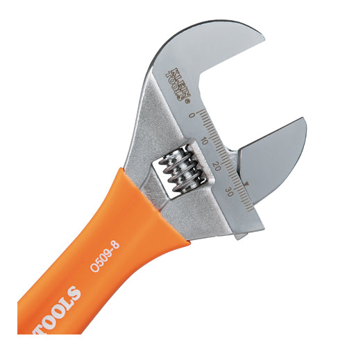 Klein Tools' 8-Inch Extra-Wide Jaw Adjustable Wrench is made of forged, heat-treated alloy steel for maximum strength and light weight. Jaws are precision-machined to ensure smooth operation. Contoured, plastic-dipped handles make them easy to grip and comfortable to use.