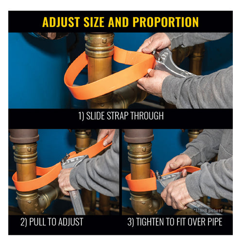 From Klein Tools, the Grip-It™ Strap Wrench is completely adjustable to work in the tightest quarters. Solidly constructed of urethane-covered, high-strength belting attached to a lightweight I-beam handle. The cam-action design permits uniform, high-torque application. The Grip-It™ Strap Wrench is made to resist scratching, damaging or deforming polished pipe and fittings, plastic pipe and fittings, oil and water filters, glass pipe, PVC conduit, and polished shafts. Also works on alternator belts, flywheels, and propeller assemblies. Grip-It™ Strap Wrenches are also available in 12-Inch and 18-Inch lengths (Cat. Nos. S12HB, S18HB)
