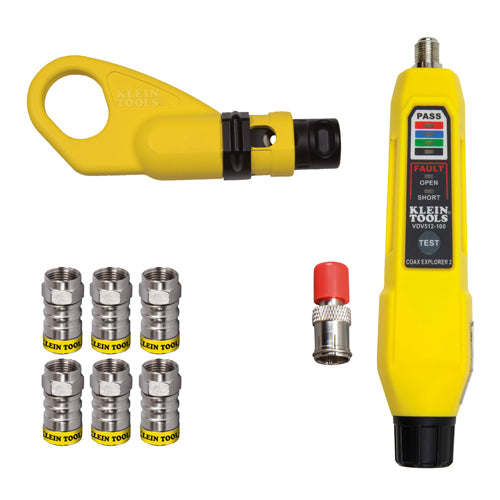 VDV110-061 Coax Cable Stripper 2-Level, Radial; VDV512-100 Coax Explorer 2 Tester; (6) Push-On F Connectors - RG6/RG6-QS