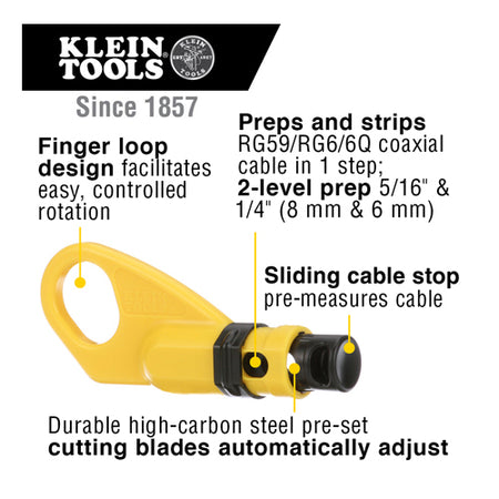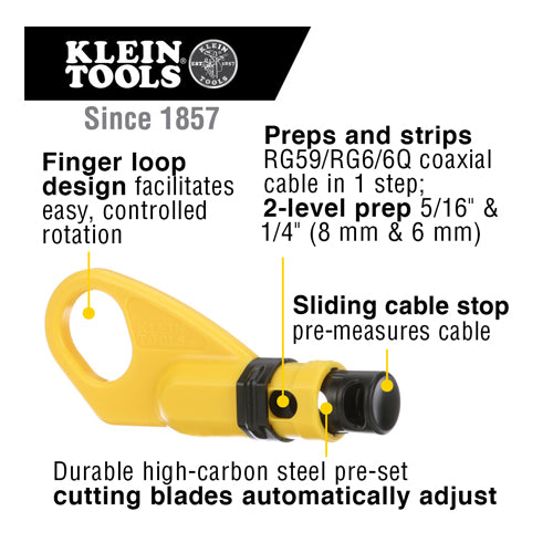 - Radial Stripper (Cat. No. VDV110-061) with 2-level, one step prep has durable high-carbon steel pre-set cutting blades for precise, accurate cable stripping