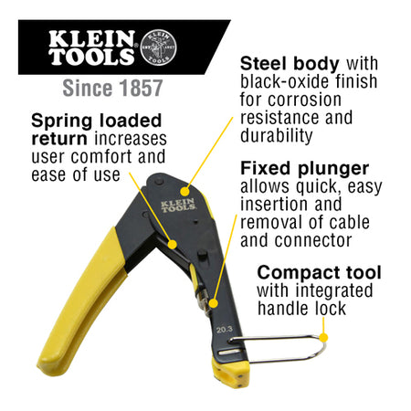 - Crimper features a fixed plunger for quick, easy insertion and removal of cable and connector