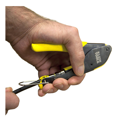 The Klein Tools Coax Installation Kit has the tools you need to prepare and connect coaxial cables with F-connectors. This kit includes a Klein Tools compact compression crimper, a 2-Level radial stripper, a multi-cable cutter, and 6 F-connectors. It also comes with a custom zipper bag.