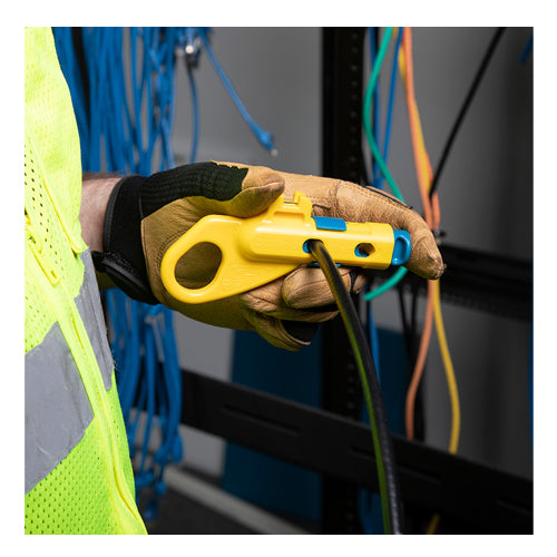 Klein Tools Combination Radial Stripper works on both twisted pair and coaxial cables. The precision, high-carbon steel blades automatically adjust to twisted pair cable diameters and won't damage internal conductors. Consistent cuts won't nick the inner sheaths. Klein's exclusive sliding depth gauge pre-measures coax cable for fast, accurate and repeatable stripping every time.