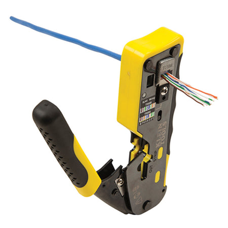 - Modular crimp-connector installation tool for voice and data applications with Pass-Thru RJ45 connector plugs