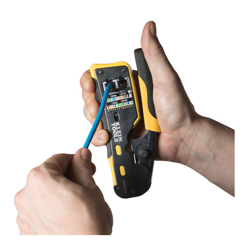 - Crimps 4, 6 and 8 position modular connectors (RJ11/RJ12 standard and RJ45 Klein Tools Pass-Thru™)