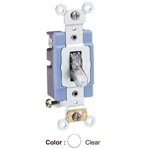 Leviton 1201-PLC, Illuminated ON Single-Pole AC Quiet Toggle Switch, Pilot Light, Requires a Neutral Wire, Industrial Grade, 15A 120V AC, Self Grounding, Back & Side Wired, Clear