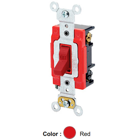 Leviton 1223-LHR, Illuminated OFF 3-Way AC Quiet Toggle Switch, Lighted Handle, Does Not Require a Neutral Wire, Industrial Grade, 20A 120V AC, Self Grounding, Back & Side Wired, Red