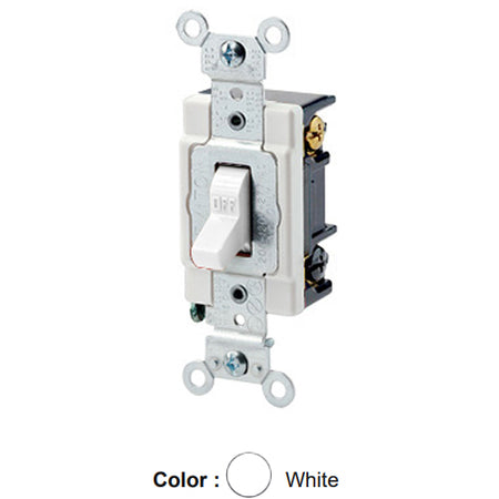 Leviton 1223-SW, Standard 3-Way AC Quiet Toggle Switch, Heavy-Duty Industrial Specification Grade, 20A 120/277V AC, Self Grounding, Back & Side Wired, White