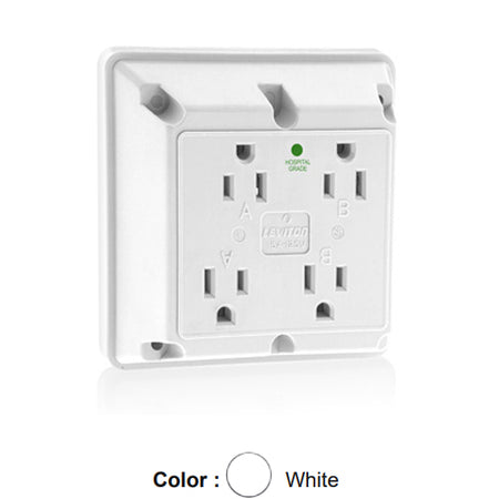 Leviton 1254-HW, 1254-H, 4-in-1 Quadruplex Receptacle, Heavy-Duty Hospital Grade, 15A 125V, NEMA 5-15R, 2-Pole, 3-Wire, Side Wire Only, White