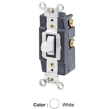 Leviton 1257-W, Single-Pole Double Throw Toggle AC Quiet Switch, Momentary Contact, Center OFF, Extra Heavy Duty Industrial Specification Grade, 20A 120/277V AC, Back & Side Wired, Self-Grounding, White