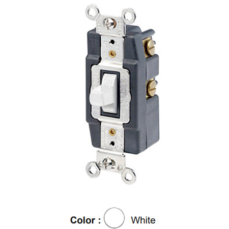 Leviton 1285-W, Single-Pole Double Throw Toggle AC Quiet Switch, Maintained Contact, Center OFF, Extra Heavy Duty Industrial Specification Grade, 20A 120/277V AC, Back & Side Wired, Self-Grounding, White