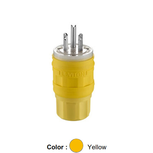 Leviton 14W34, Wetguard Watertight Straight Blade Plug, Industrial Grade, 15A 277V, NEMA 7-15P, 2-Pole, 3-Wire, Grounding, Yellow