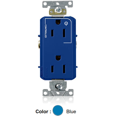 Leviton 16252-1PB, Decora Plus Straight Blade Duplex Receptacle, Heavy-Duty Industrial Specification Grade, Split-Circuit, One Outlet Marked ''Controlled'', Smooth Face, 15A 125V, NEMA 5-15R, 2-Pole, 3-Wire, Back and Side Wire, Blue