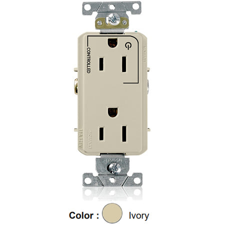 Leviton 16252-1PI, Decora Plus Straight Blade Duplex Receptacle, Heavy-Duty Industrial Specification Grade, Split-Circuit, One Outlet Marked ''Controlled'', Smooth Face, 15A 125V, NEMA 5-15R, 2-Pole, 3-Wire, Back and Side Wire, Ivory
