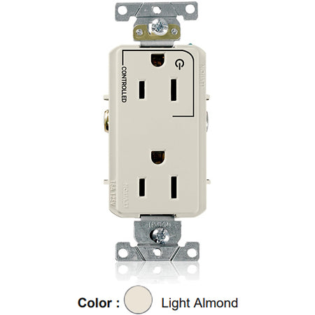 Leviton 16252-1PT, Decora Plus Straight Blade Duplex Receptacle, Heavy-Duty Industrial Specification Grade, Split-Circuit, One Outlet Marked ''Controlled'', Smooth Face, 15A 125V, NEMA 5-15R, 2-Pole, 3-Wire, Back and Side Wire, Light Almond