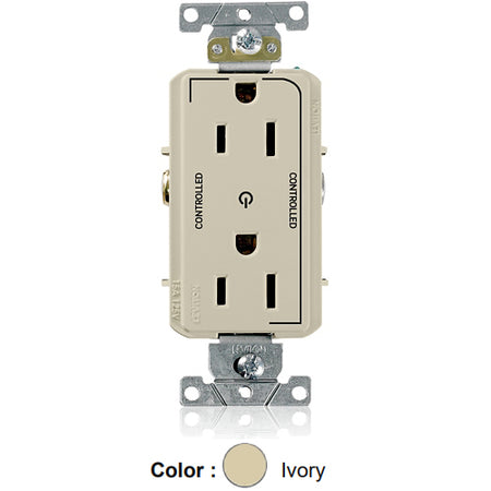 Leviton 16252-2PI, Decora Plus Straight Blade Duplex Receptacle, Heavy-Duty Industrial Specification Grade, Two Outlets Marked ''Controlled'', Smooth Face, 15A 125V, NEMA 5-15R, 2-Pole, 3-Wire, Back and Side Wire, Ivory
