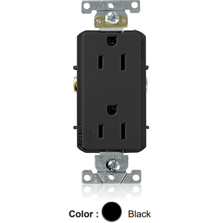 Leviton 16252-E, Decora Plus Straight Blade Duplex Receptacle, Heavy-Duty Industrial Specification Grade, Smooth Face, 15A 125V, NEMA 5-15R, 2-Pole, 3-Wire, Back and Side Wire, Black