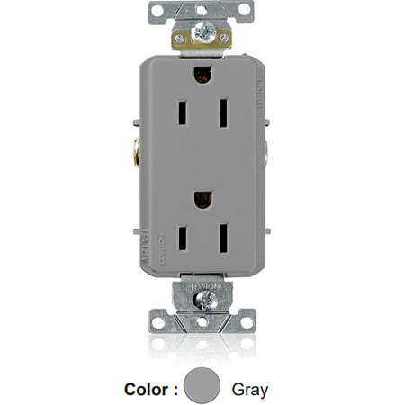 Leviton 16252-GY, Decora Plus Straight Blade Duplex Receptacle, Heavy-Duty Industrial Specification Grade, Smooth Face, 15A 125V, NEMA 5-15R, 2-Pole, 3-Wire, Back and Side Wire, Gray