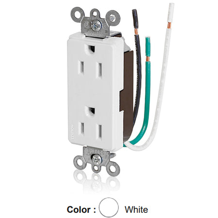 Leviton 16252-LW, Decora Plus Straight Blade Duplex Receptacle, Commercial Specification Grade, Smooth Face, Pre-Wired Leads, 15A 125V, NEMA 5-15R, 2-Pole, 3-Wire, White