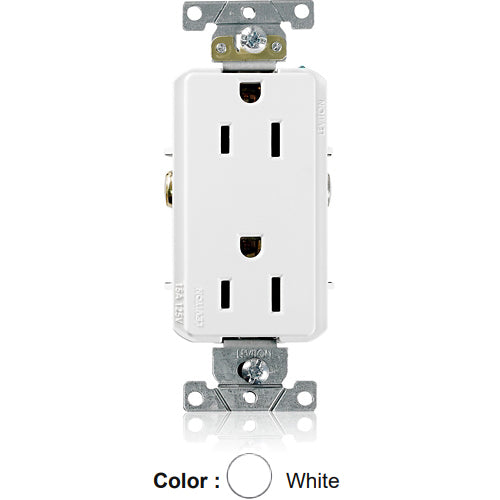 Leviton 16252-W, Decora Plus Straight Blade Duplex Receptacle, Heavy-Duty Industrial Specification Grade, Smooth Face, 15A 125V, NEMA 5-15R, 2-Pole, 3-Wire, Back and Side Wire, White