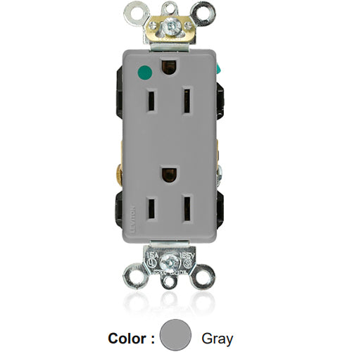 Leviton 16262-HGG, Decora Plus Straight Blade Duplex Receptacle, Extra Heavy-Duty Hospital Grade, Smooth Face, 15A 125V, NEMA 5-15R, 2-Pole, 3-Wire, Self-Grounding, Back or Side Wire, Gray