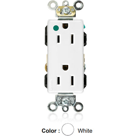 Leviton 16262-HGW, Decora Plus Straight Blade Duplex Receptacle, Extra Heavy-Duty Hospital Grade, Smooth Face, 15A 125V, NEMA 5-15R, 2-Pole, 3-Wire, Back and Side Wire, White