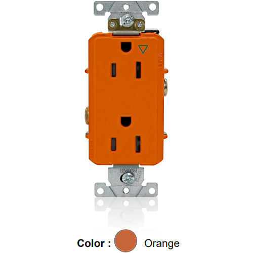 Leviton 16262-OIG, Decora Plus Straight Blade Duplex Receptacle, Heavy-Duty Industrial Specification Grade, Smooth Face, Isolated Ground, 15A 125V, NEMA 5-15R, 2-Pole, 3-Wire, Back and Side Wire, Orange