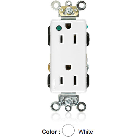 Leviton 16262-PLW, Decora Plus Straight Blade Duplex Receptacle, Extra Heavy-Duty Hospital Grade, Power Indication, Smooth Face, 15A 125V, NEMA 5-15R, 2-Pole, 3-Wire, Back and Side Wire, White