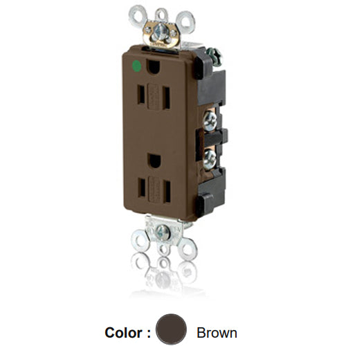 Leviton 16262-SG, Decora Plus Straight Blade Duplex Receptacle, Extra Heavy-Duty Hospital Grade, Tamper-Resistant, Smooth Face, 15A 125V, NEMA 5-15R, 2-Pole, 3-Wire, Back and Side Wire, Brown