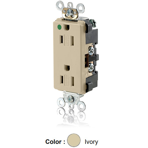 Leviton 16262-SGI, Decora Plus Straight Blade Duplex Receptacle, Extra Heavy-Duty Hospital Grade, Tamper-Resistant, Smooth Face, 15A 125V, NEMA 5-15R, 2-Pole, 3-Wire, Back and Side Wire, Ivory