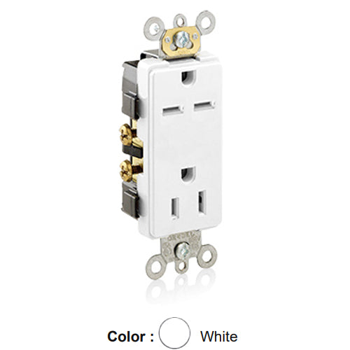 Leviton 16292-W, Decora Plus Straight Blade Duplex Receptacle, Commercial Specification Grade, Dual Voltage, Smooth Face, 15A 125/250V, NEMA 5-15R/6-15R, 2-Pole, 3-Wire, Back and Side Wire, White