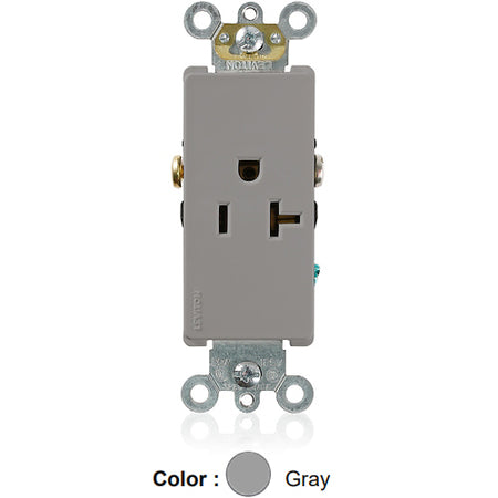 Leviton 16341-GY, Decora Plus Straight Blade Single Receptacle, Commercial Specification Grade, Smooth Face, 20A 125V, NEMA 5-20R, 2-Pole, 3-Wire, Side Wire Only, Gray
