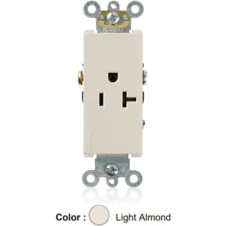 Leviton 16341-T, Decora Plus Straight Blade Single Receptacle, Commercial Specification Grade, Smooth Face, 20A 125V, NEMA 5-20R, 2-Pole, 3-Wire, Side Wire Only, Light Almond