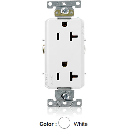Leviton 16342-W, Decora Plus Straight Blade Duplex Receptacle, Heavy-Duty Industrial Specification Grade, Smooth Face, 20A 125V, NEMA 5-20R, 2-Pole, 3-Wire, Side Wire Only, White