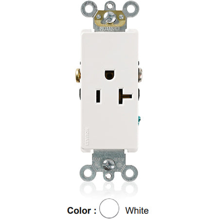Leviton 16351-W, Decora Plus Straight Blade Single Receptacle, Commercial Specification Grade, Smooth Face, 20A 125V, NEMA 5-20R, 2-Pole, 3-Wire, Back and Side Wire, White