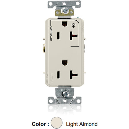 Leviton 16352-1PT, Decora Plus Straight Blade Duplex Receptacle, Heavy-Duty Industrial Specification Grade, Split-Circuit, One Outlet Marked ''Controlled'', Smooth Face, 20A 125V, NEMA 5-20R, 2-Pole, 3-Wire, Back and Side Wire, Light Almond
