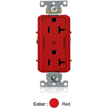Leviton 16352-2PR, Decora Plus Straight Blade Duplex Receptacle, Heavy-Duty Industrial Specification Grade, Two Outlets Marked ''Controlled'', Smooth Face, 20A 125V, NEMA 5-20R, 2-Pole, 3-Wire, Back and Side Wire, Red